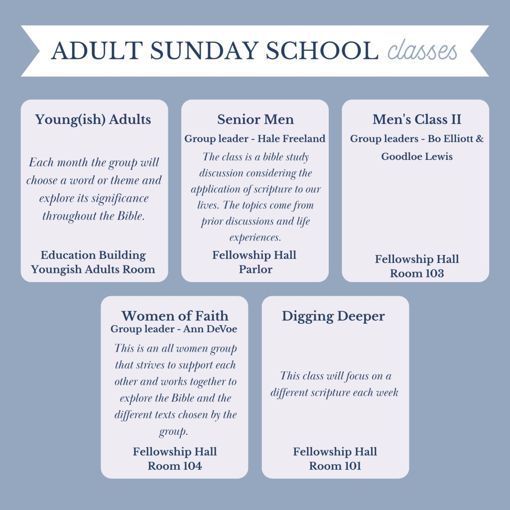 Christian discipleship is a life-long process for all Christians. Our Christian education ministry seeks to provide enriching opportunities for the strengthen of our faith. To that end, we offer several adult Sunday School classes, which meet Sunday mornings 9:00AM, as well as other events throughout the year. Members and visitors are welcome to any of these events.