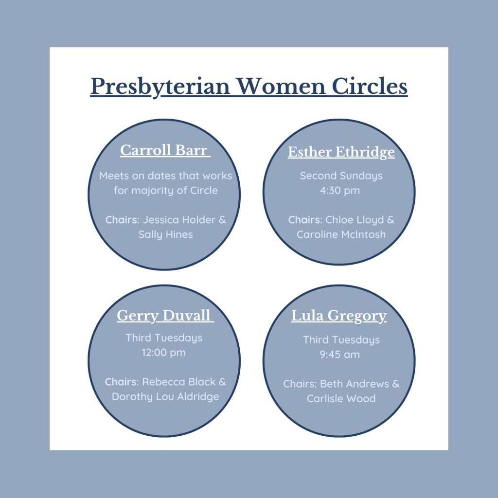 Presbyterian Women meet in small groups known as circles once a month for Bible study, fellowship and mission. All women are invited to participate. Call the church office to find the time that suits you best.